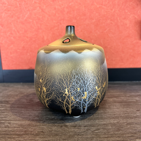 黒地をベースに木立と連山が描かれ金箔が散りばめられた香炉は、哀愁漂う落ち着いた雰囲気を醸し出しています。